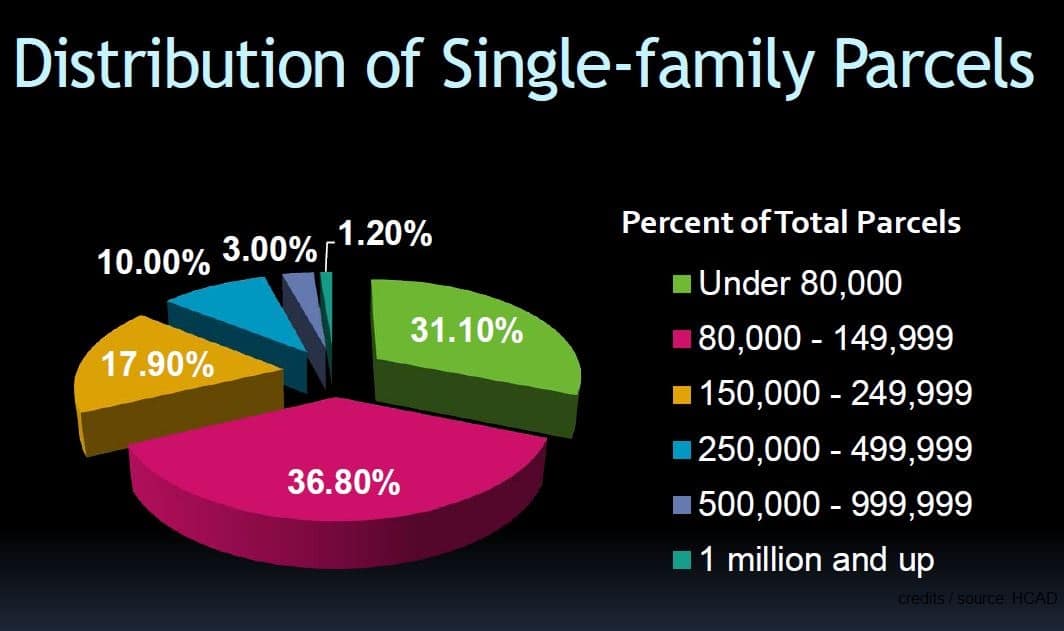 The distribution of single family parcels in Harris County is shown below (according to HCAD). Â Roughly 893,019 homes (85.8% of the total number of parcels)Â make up the residential sector of the tax base that is assessed below $250,000.